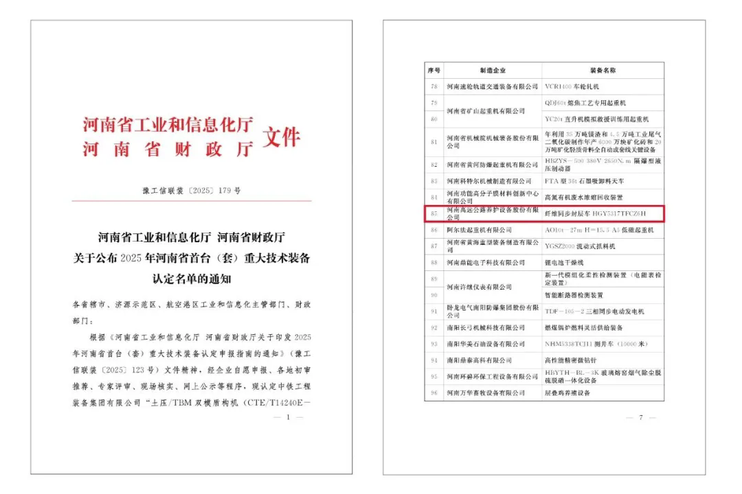 近日,2025年河南省首臺(套)重大技術裝備認定名單正式發布,由公路養護裝備國家工程研究中心研發、高遠圣工生產的纖維同步封層車(HGY5317TFCZ6H)被認定為首臺(套)重大技術裝備。