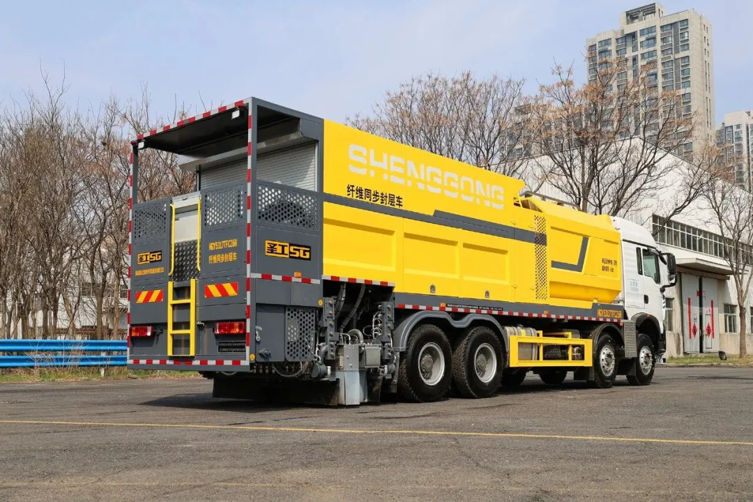 該裝備突破了傳統同步封層車功能單一的局限,創新集成纖維自動計量撒布、瀝青精準控溫噴灑、智能施工參數匹配等核心技術,可實現“瀝青-纖維-瀝青-骨料”四層同步作業,顯著提高路面抗裂、抗滑性能,延長使用壽命。